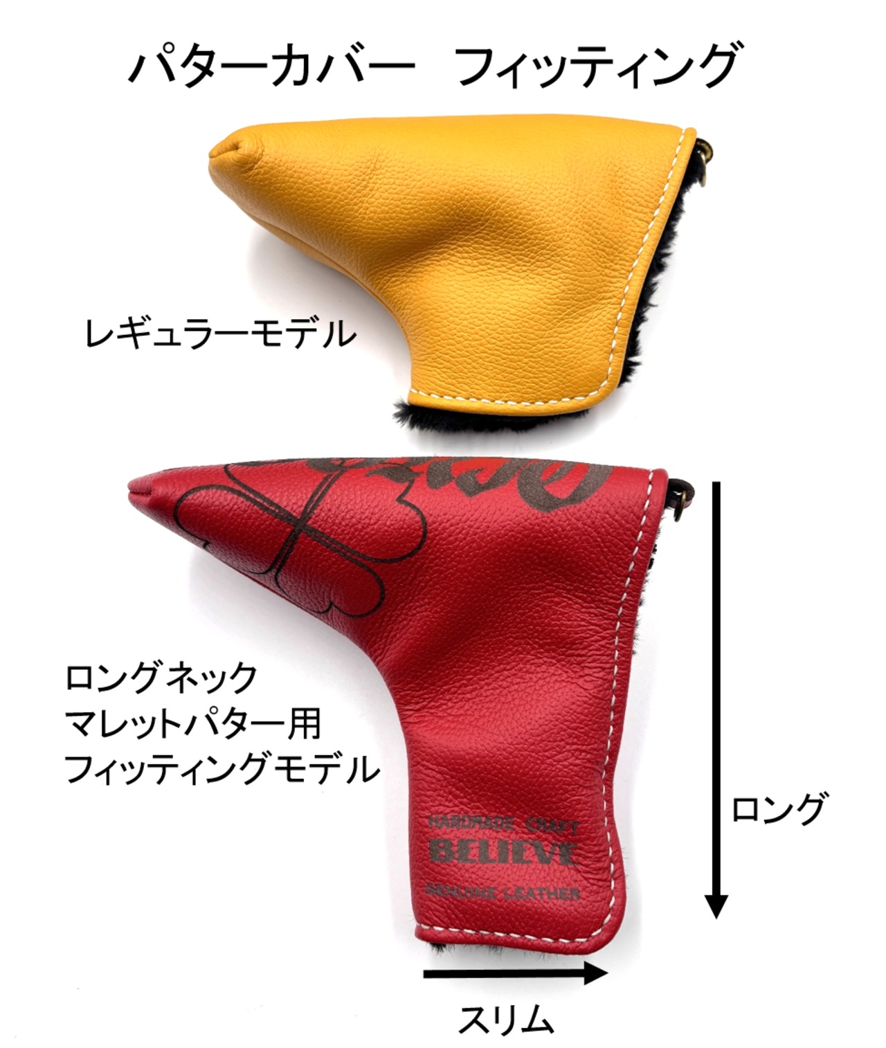 多くのパターに対応できるよう大き目な作りとなっています。”コンパクトなマレットパターに合わせてほしい”などのカバーサイズフィッティングもできますので、是非問い合わせください。