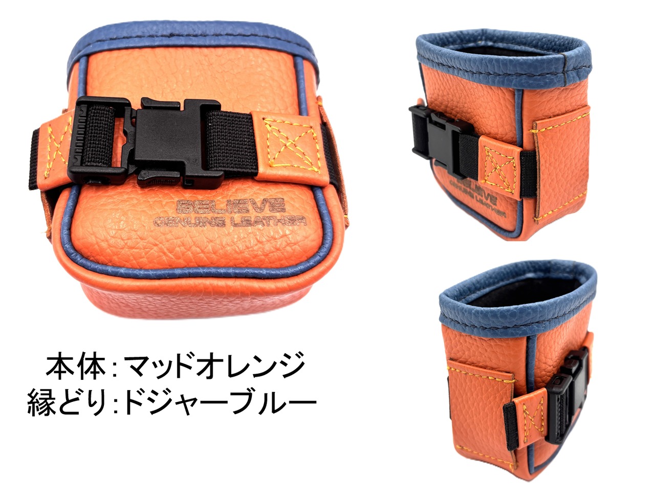 ★カラーは、ネイビー、マッドオレンジ、マッドキャメルの3色。オプションカラーやその他カラーもご準備できますのでお問合せください(ポーチ本体と縁取り部分の色を変える事も可能です)。