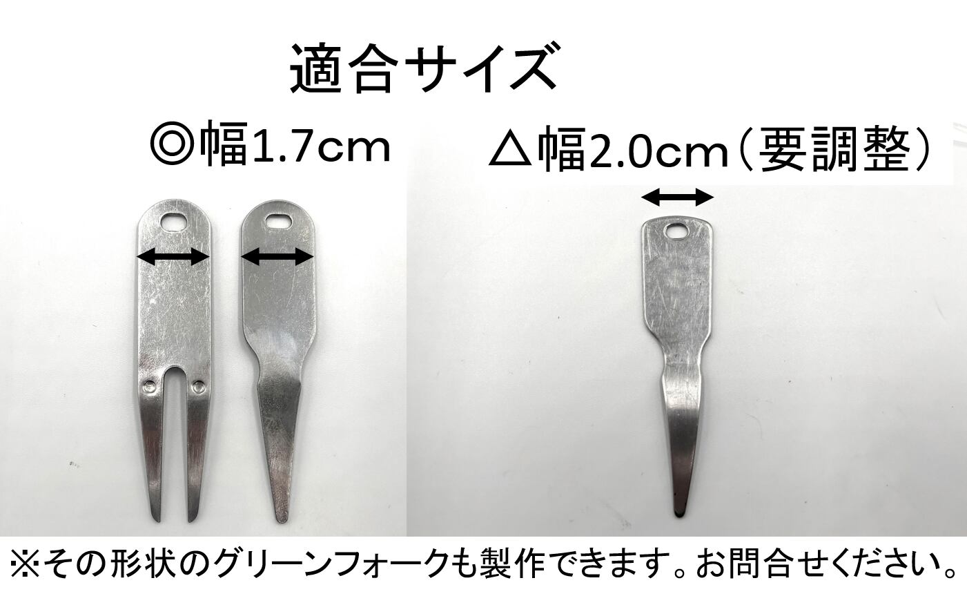 ★ゴルフ場に置いてあることが多い、金属の一本刃、二本刃の幅1.7cmのグリーンフォークに適合。幅2.0㎝は調整して対応できますので、備考欄にその旨記入願います。